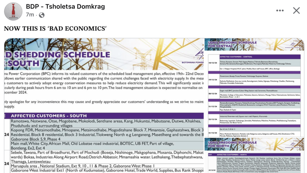 The Botswana Democratic Party (BDP), still reeling from its historic defeat in the October 2024 general elections, has criticized the Botswana Power Corporation’s (BPC) planned load-shedding measures, describing them as “bad economics.”